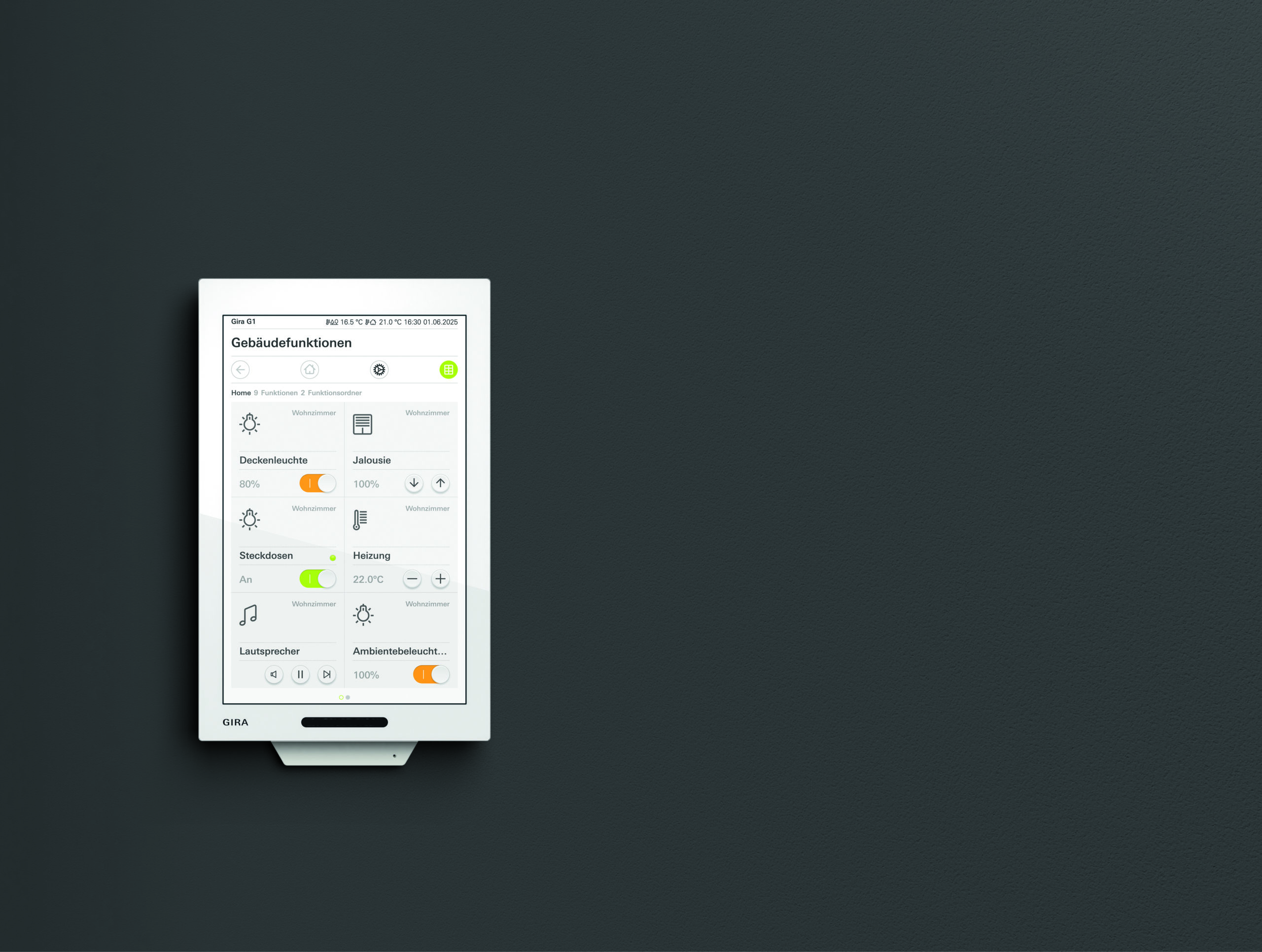 Erleben Sie intelligente Gebäudesteuerung in ihrer schönsten Form: Der neue Gira G1 überzeugt mit einem hochauflösenden Multitouch-Display, intuitiver Bedienung durch Wischgesten und integrierter Sensorik für Helligkeit, Temperatur und Luftfeuchtigkeit. Ein echtes Kraftpaket für moderne Smart Homes – leistungsstark, elegant und zukunftssicher.